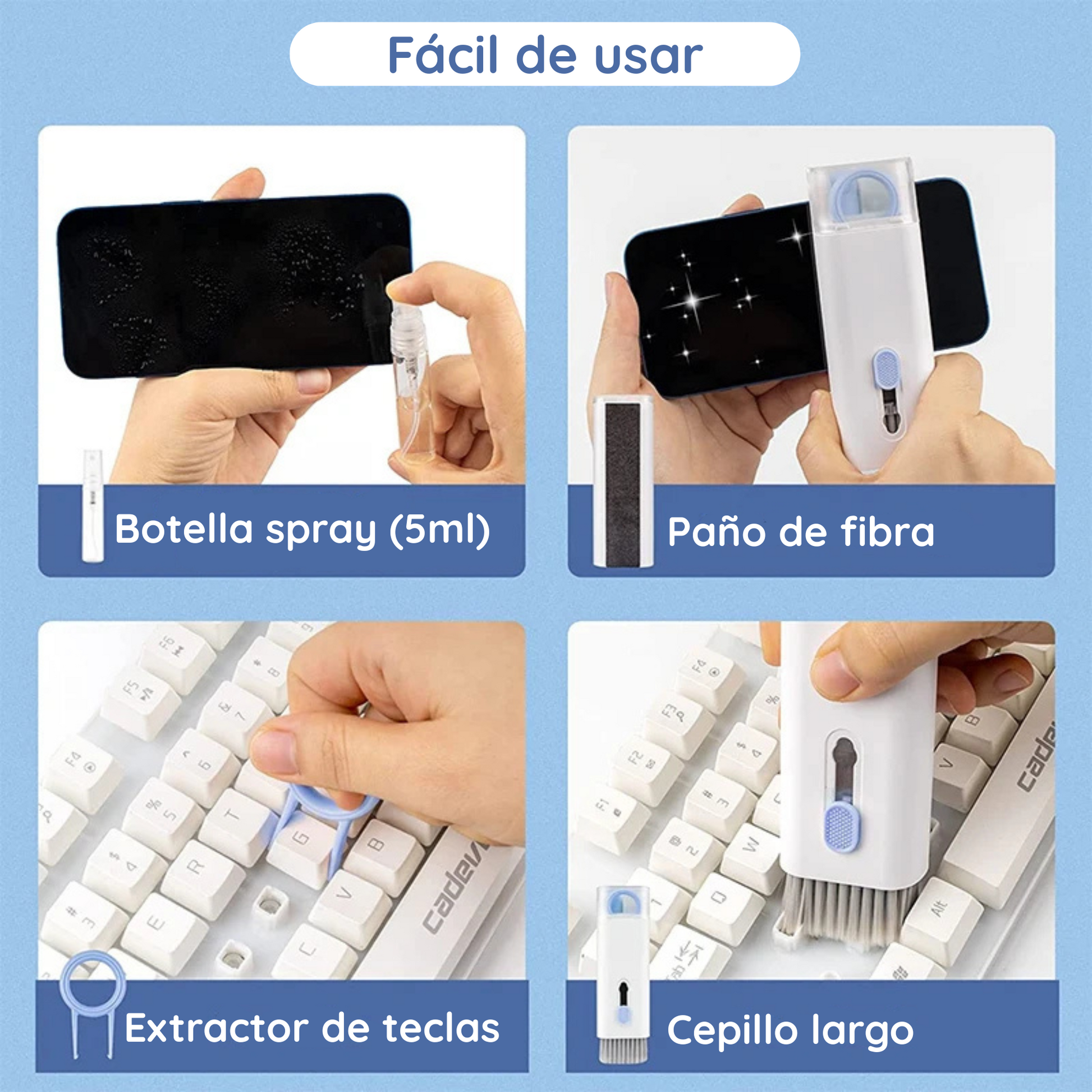Este Kit incluye todo tipo de adaptaciones para limpiar a fondo todos tus dispositivos electrónicos.